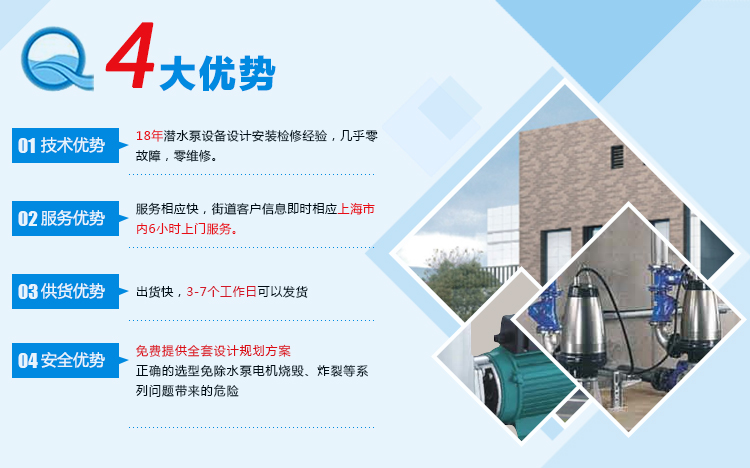 3、由于潜入水中运行,可以大大简化泵站的土建及建筑结构工程,减少安装面积,节约工程造价30~40%。