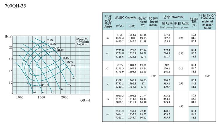 QH系列潜水混流泵700QH-35是传统的混流泵——电动机机组的更新换代产品。由于电机号与水泵构成一体,潜入水中运行,具有传统机组一系列无法比拟的优点。由于电机与水泵构成一体,无需在安装现场进行耗工、耗时复杂的轴线对中装配工序,现场安装十分方便。由于潜入水中运行,可以大大简化泵站的土建及建筑工程,减少安装面积,节约泵站的工程总造价30-40%。泵在水中运行,水流从电机周围通过,噪声低,电机冷却条件好。如有必要可以建设地下泵站,保持地面的环境风貌。操作方便、运行可靠、维护保养方便。采用混流潜水电泵是解决在水位涨落大的沿江、湖泊地区建泵站和防洪问题彻底的方法,省去了机泵间的长轴,提高运行安全可靠性。该泵广泛适用于工农业输送、城市给水、轻度污水排放和调水工程。