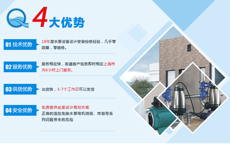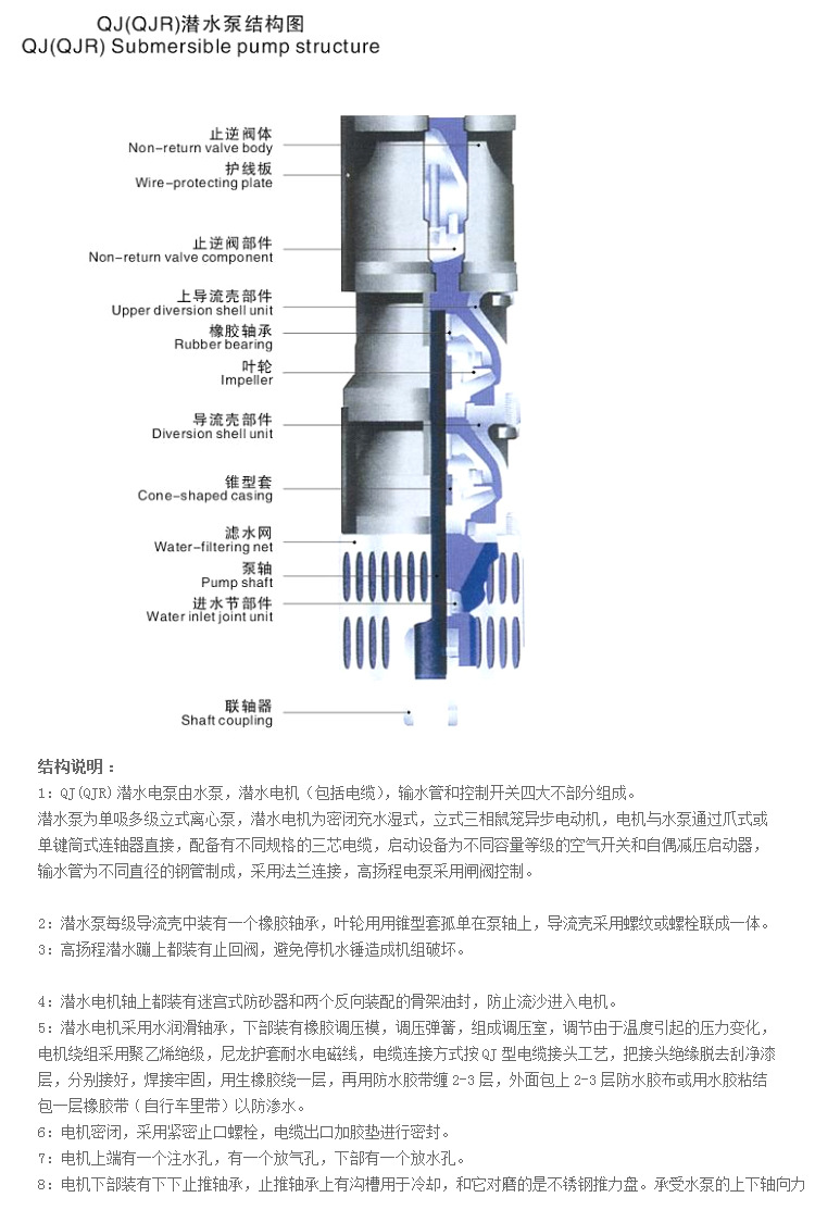 1、电机,水泵一体,潜入水中运行,安全可靠。
