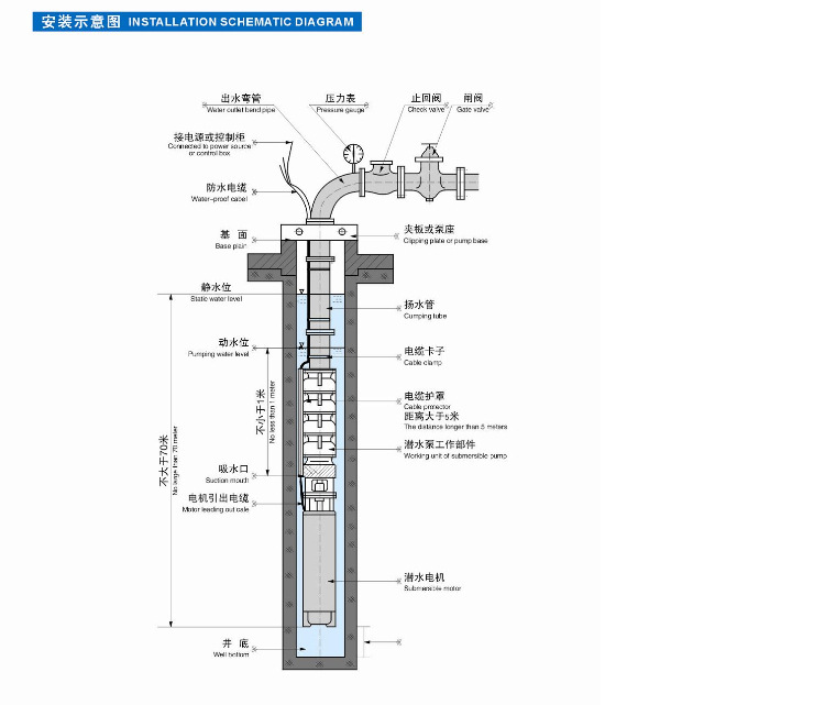2,水泵进出口必须在动水位1米以下,但潜水深度不得超过静水位70米,电机下端距 井底水深至少在1米以上。