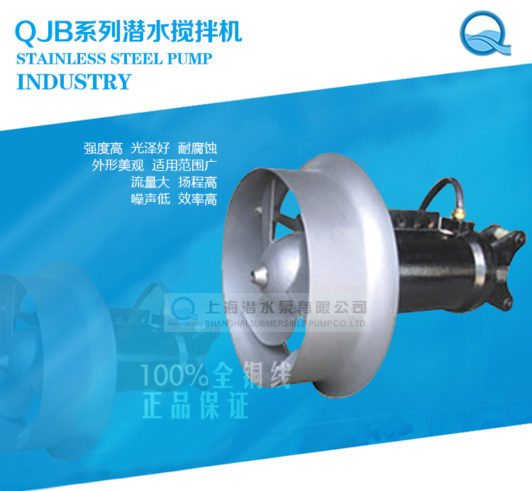 上海潜水泵有限 公司专业生产销售QJB系列潜水搅拌机QJB4/4-2500/2-42/P/AL适用于污水处理厂的工艺流程中推进搅拌含有悬浮物的污水、稀 泥浆、工业过程液体等,创建水流,加强搅拌功能,防止污泥沉淀及产生死角,是市政和工业污水处理 工艺流程上的重要设备,在水处理工艺流程中,可实现生化过程中固液二相和固液气三相的均质,流动 的工艺要求。QJB系列潜水搅拌机QJB4/4-2500/2-42/P/AL由潜水电机、叶桨和安装系统等组成。根据传动方式的不同,潜水搅拌 机可分为:混合搅拌和低速推流两大系列。 混合搅拌系列产品常选用多级电机,采用直联式结构,它 与传统相比,具有结构紧凑、能耗低、效率高、便于维便于维护保养等优点。叶轮制造精度高、推力大 。QJB型潜水搅拌机系列产品适用于需要固液搅拌、混合的场合。