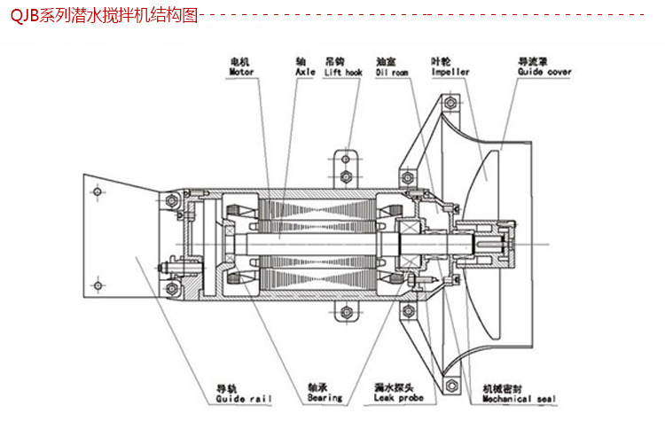 通过水下电机带 动特殊结构的螺旋桨叶低俗转动,产生低切向流动的强力水流,使液体增加动力,并产生强烈的搅动,减少 了水下沉淀,从而达到液体搅拌及流动的目的.