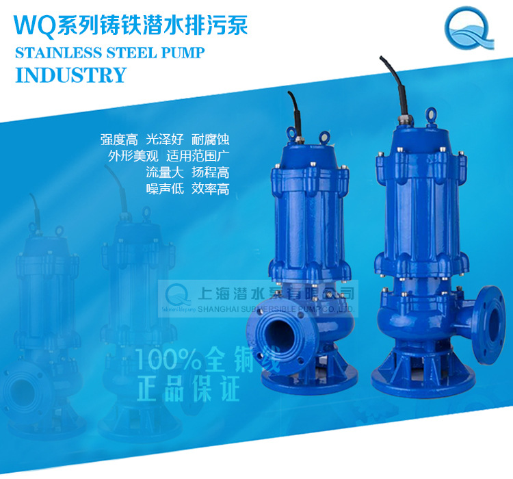 WQ系列铸铁潜水排污泵50WQ15-8 -0.75主要用于市政工程、工业建筑、宾馆、医院、人防、矿山等行业,可用于排送带固体颗粒及格子长纤维的污水、废水、雨水和城市生活用水。