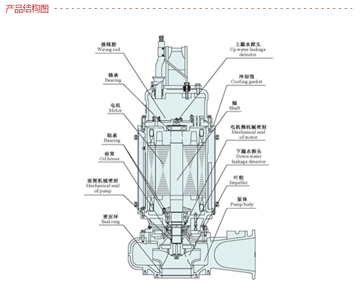 4、铸铁无堵塞排污泵密封油室内设置有高精度抗干扰漏水检测传感器,定子绕组内预埋了热敏元件,对水泵电机自动保护。