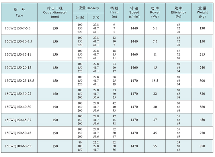 WQ150口径系列撕裂装置污水污物潜水电泵