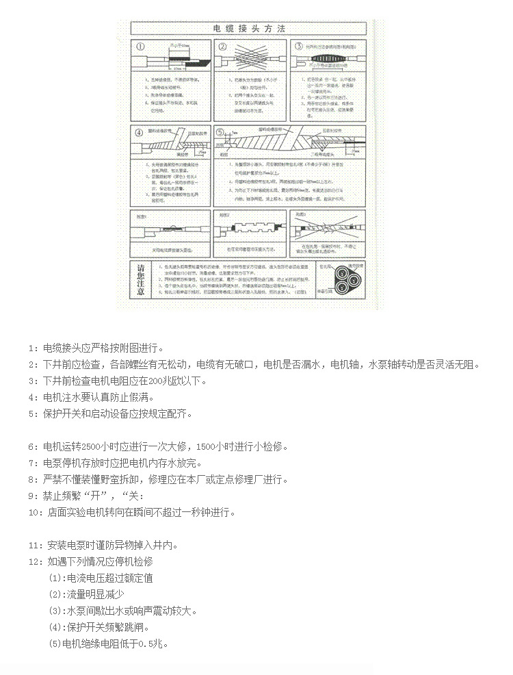 2,水泵进出口必须在动水位1米以下,但潜水深度不得超过静水位70米,电机下端距 井底水深至少在1米以上。